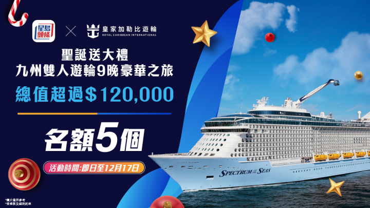 《星岛头条》APP更联乘皇家加勒比游轮送出「皇家加勒比『海洋光谱号』:日本九州双人9晚游轮假期露台房」(共5套),每套价值HK$25,256。大家由即日上午6时起至12月17日凌晨12时正,只要下载《星岛头条》APP兼登记成为新会员,并回答一个简单问题,答案最有创意的5位幸运儿,即有机会得到奖品。大家请立即下载《星岛头条》APP,把握机会拎走丰富的圣诞大奖。