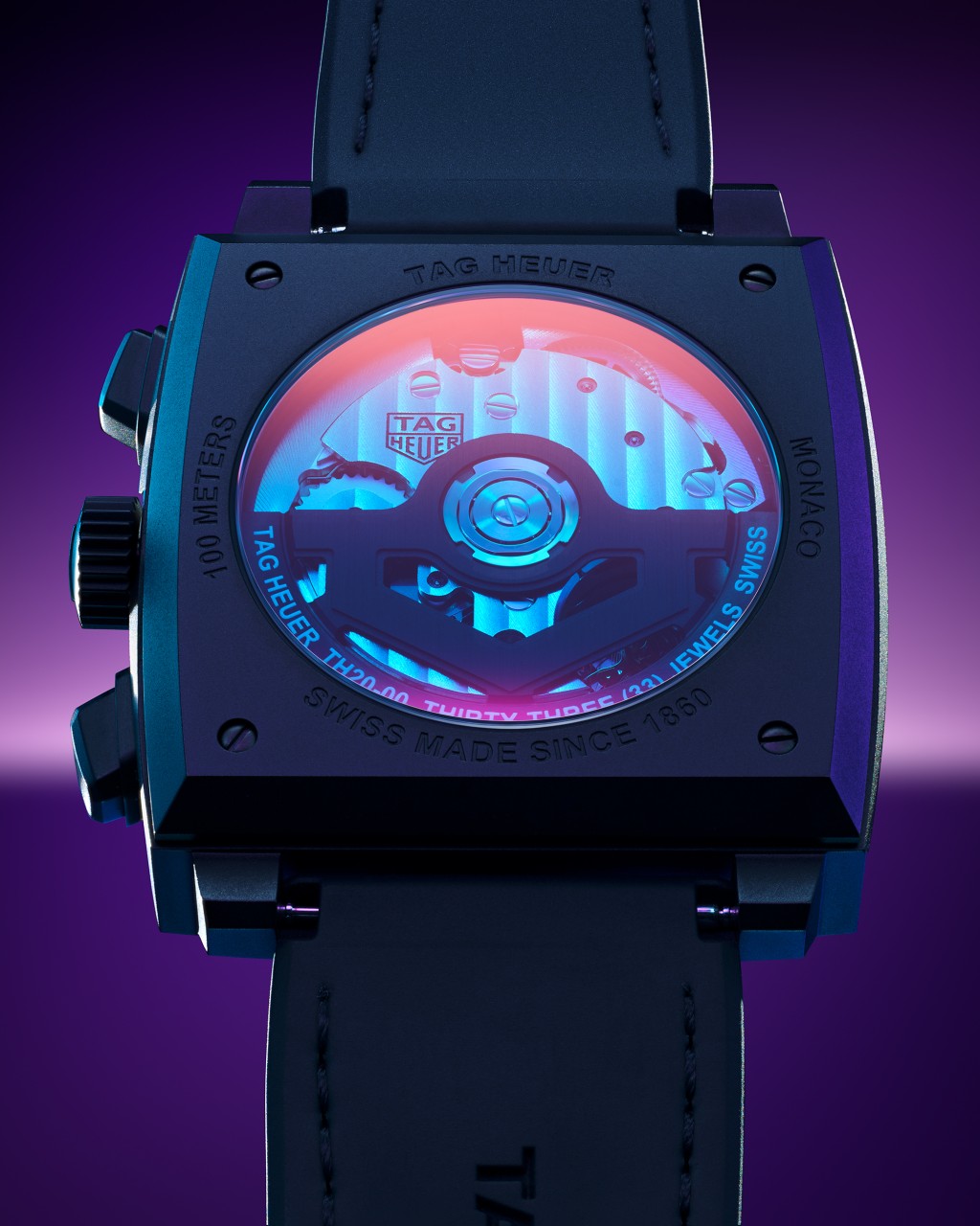 Tag Heuer这款Monaco计时腕表的镂空表盘色调非常迷人,不但令机芯清楚展现,而色彩更由上而下从紫色渐变至深蓝色,有如黄昏日落的醉人景色。配上绿松石色计时指针和刻度,还有绿色夜光衬底的日期视窗,恍如大都会的霓虹灯般夺目耀眼。