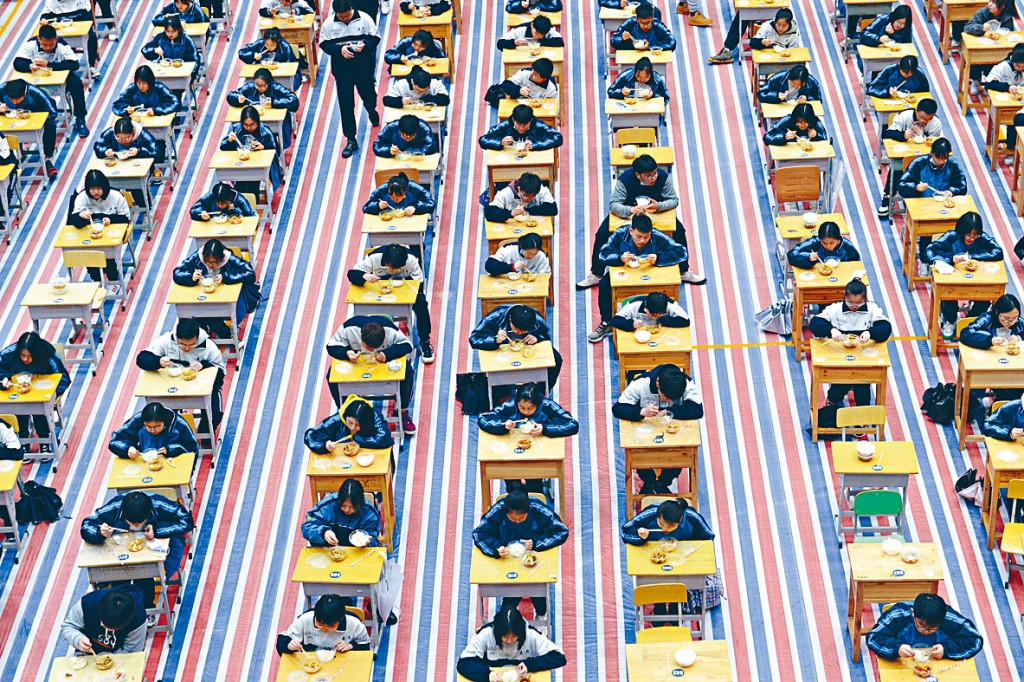 (星岛日报报道)内地学校陆续复课,校方做足防疫措施。湖南省长沙市长郡湘府中学近日将学校体育馆改造成临时食堂。食堂工作人员提前将饭菜摆放在体育馆内间距一米以上的课桌上,该校高二年级四百八十名学生凭编号入座就餐。