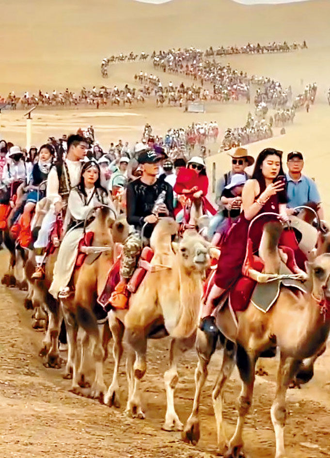 中秋国庆长假,各地景区爆满。甘肃敦煌鸣沙山月牙泉景区出现「塞骆驼」奇景。游客拍摄的影片显示,游客骑乘的骆驼队伍长长不见尾,有网友惊叹:走出了丝绸之路的壮丽。为让骆驼队有序行走,景区管理人员在广阔的沙漠上,加设了「骆驼」交通灯,成为黄沙中的新亮点。