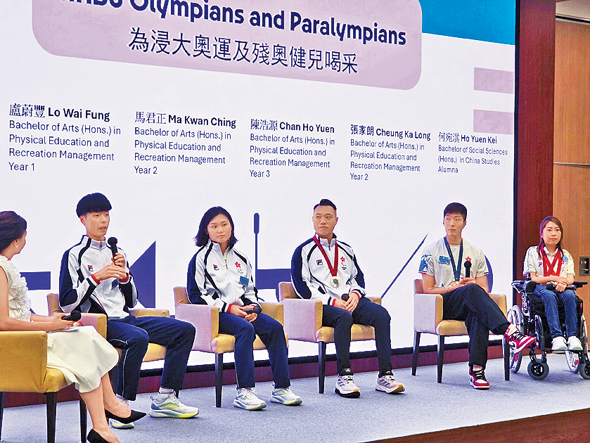 浸大昨举办「为浸大奥运及残奥健儿喝采」分享会(见图),庆祝浸大学生及校友运动员在今届奥运会及残奥会取得佳绩,超过200名浸大教职员及学生等出席。其中,浸大学生运动员陈浩源、张家朗、卢蔚丰及马君正获颁奖学金,校友何宛淇亦有出席。