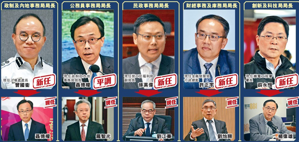(星岛日报报道)特首林郑月娥任期余下两年多,政府问责班底昨天传出改组消息。据悉,今次改组班子涉及五个政策局,当中现任政制及内地事务局局长聂德权将平调掌公务员事务局,接替退任的罗智光;现任入境处处长曾国衞会升任为政制局局长。其他三个政策局,包括民政事务局、财经事务及库务局和创新及科技局的原任局长亦将离职,分别由现任劳工及福利局副局长徐英伟、香港金融发展局行政总监许正宇及机电工程署署长薛永恒接替。据了解,中央最快今日公布新的主要官员任免,而林郑月娥亦会随即率领新问责官员亮相。