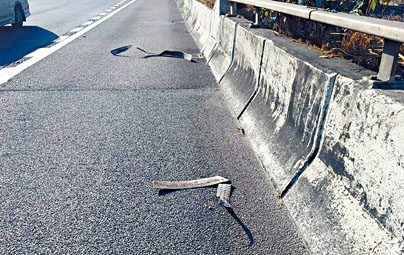 (星岛日报报道)一辆货车昨晨九时沿西九龙快速公路西行,途经大角嘴奥海城对开,疑跌出三块约半米长铁片遗在路中(见图),其间先后有十辆汽车驶经,分别被铁片刺穿车胎,幸未引致交通意外,司机纷纷停车路肩及召拖车处理,现场交通未受影响。
