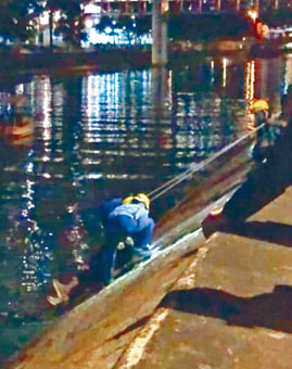 昨晚九时许,有市民途经大埔警署对开林村河边,发现一名少年怀疑堕海遇溺,于是致电报案,消防员(见图)接报到场时,该名十四岁少年已自行游近岸边,立即将他救上行人路,由于事主脚部受伤,须由救护车送往大埔那打素医院治理。