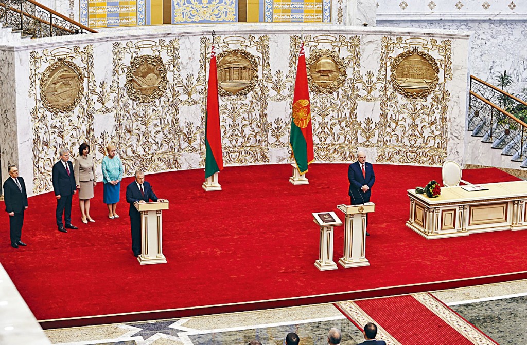 (星岛日报报道)白俄罗斯总统卢卡申科(图右)周三在首都明斯克的独立宫,在没有事先宣布下,秘密宣誓就职,第六次出任总统,官员、议员、各地方负责人,以及各界知名人士共七百多人,出席总统就职礼。卢卡申科发表演说时指出,今年白俄罗斯遭受了前所未有的挑战,「颜色革命」未能得逞。在八月九日举行的总统选举中,卢卡申科以八成得票率胜出,随后明斯克等城市多次发生大型示威,对选举结果提出质疑。目前,该国各地的示威仍未完全停止。德国政府发言人昨日表示,不会承认卢卡申科连任总统,指欠缺「民主合法性」,不公平也没有自由。