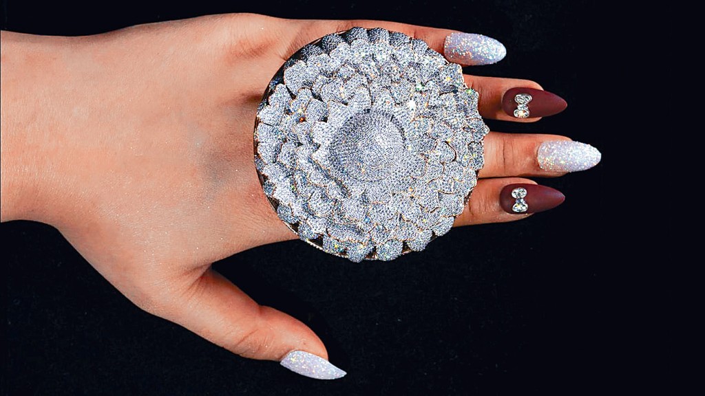 (星岛日报报道)印度Renani珠宝公司创办人班萨尔设计的一枚钻戒最近获得健力士世界纪录证,全凭戒指上镶有一万二千六百三十八颗钻石,打破之前另一枚有七千八百零一颗钻石钻戒的旧纪录。这枚钻戒总重量逾一百六十五克,使用的钻石重逾三十八克拉。据报,班萨尔是于上月二十一日发布这枚「万寿菊——繁荣之戒」。印度人相信万寿菊可以带来繁荣与幸运,而戒指整体看起来也像一朵正在绽放的菊花,每一层的花瓣都镶嵌满天然钻石。
