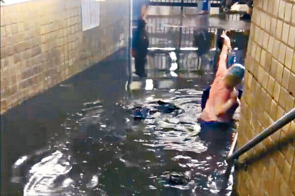 (星岛日报报道)热带风暴艾尔莎(Elsa)挟带狂风豪雨肆虐佛罗里达州后,在美国东岸继续朝北移动,尚未抵达纽约,已为当地带来大雨,造成数个地铁站淹水、主要道路交通中断。国家气象局表示,周四下午连串大雷雨在纽约市和周围地区累积降雨量达二十五至一百毫米,造成部分地区洪水泛滥。曼克顿北方第一五七街地铁站月台淹水的上载网上影片,可见数名乘客跨越水深及腰的一池黑水才能抵达月台。纽约大都会运输局(MTA)局长费恩柏格表示,一号线和A线受到明显影响,车站淹水情况严重。纽约包括在布朗克斯区的一些主要道路也暂时关闭。国家气象局警告,预计纽约周五上午会再出豪雨及淹水情况。