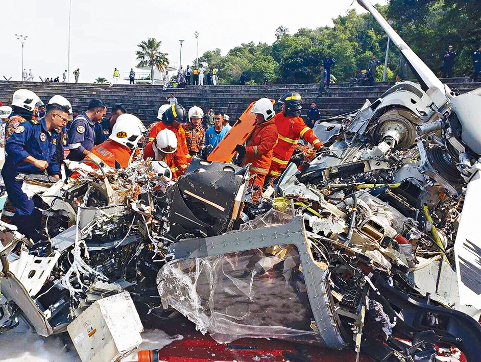 马来西亚红土坎海军基地的两架直升机,周二在空中相撞后坠毁,两架机上10人全部罹难。这两架直升机当时正在为大马皇家海军建军日彩排,疑因过于接近导致相撞坠毁。网上流传的录影片段可见,其中一架机撞上另一机的后旋翼,导致两机坠毁。