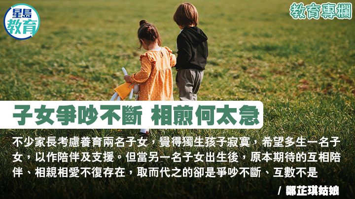 其实兄弟姊妹争吵是正常不过之事,我们计划「生多个」时,不是也希望他们学习与他人合作及相处吗?合作及相处,并不是只要有同伴就能学懂的;相反,是要通过经历不同事情,不论是与他人目标一致,还是意见不合,他们都能从中学习表达自己及了解他人,并学习解决不同的纷争及问题。