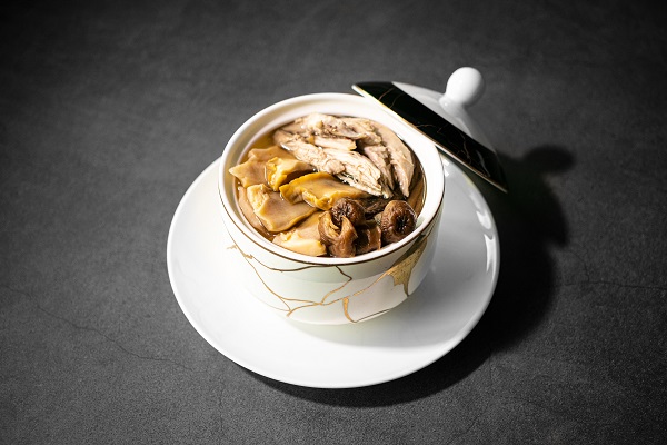 八道手工中菜依序上桌:天外天三小碟、榆耳芦笋带子炒虾球、鹿茸菌响螺炖法国鹌鹑、虾子花菇千层扒菜苗、古法蒸龙趸斑件、玫瑰豉油鸡、樱花虾带子蟹肉炒饭及甜点。鹿茸菌响螺炖法国鹌鹑是王师傅最拿手的滋润炖汤,精挑法国鹌鹑伴滋阴的响螺及鹿茸菌,清甜美颜。至于榆耳芦笋带子炒虾球则鲜甜爽脆,用养生的榆耳配鲜甜带子与虾球,即使嘴刁的妈咪也一定满意。