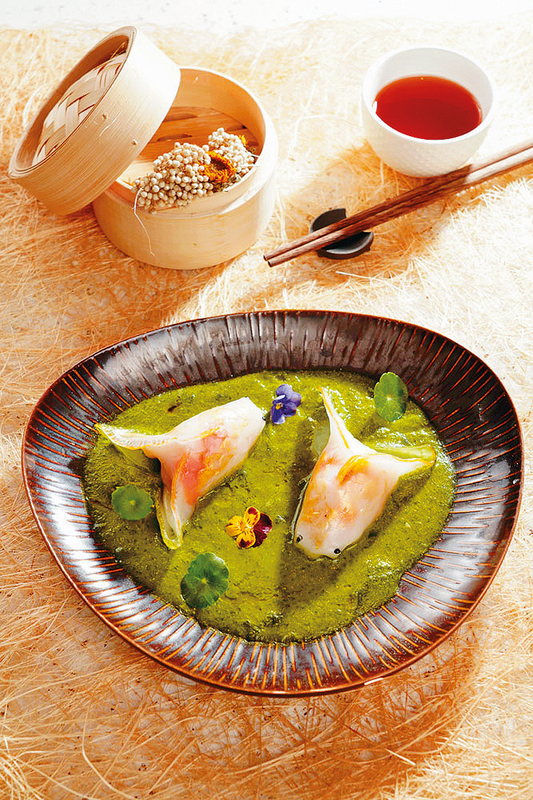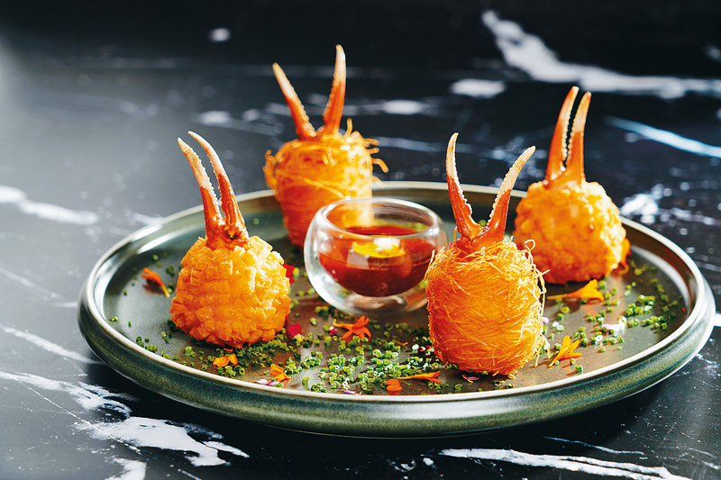 考大厨控制火候的油浸笋壳鱼,先用盐腌,再以滚油浸笋壳鱼,须凭鱼的大小来控油温,考烹技和耐性。百花酿蟹钳经改良,外层的面包糠改成手切面包粒,丰富了口感。银杏百页豆腐见大厨刀功,豆腐薄片配清炒素鸡、灯笼椒等素材,质感有层次。