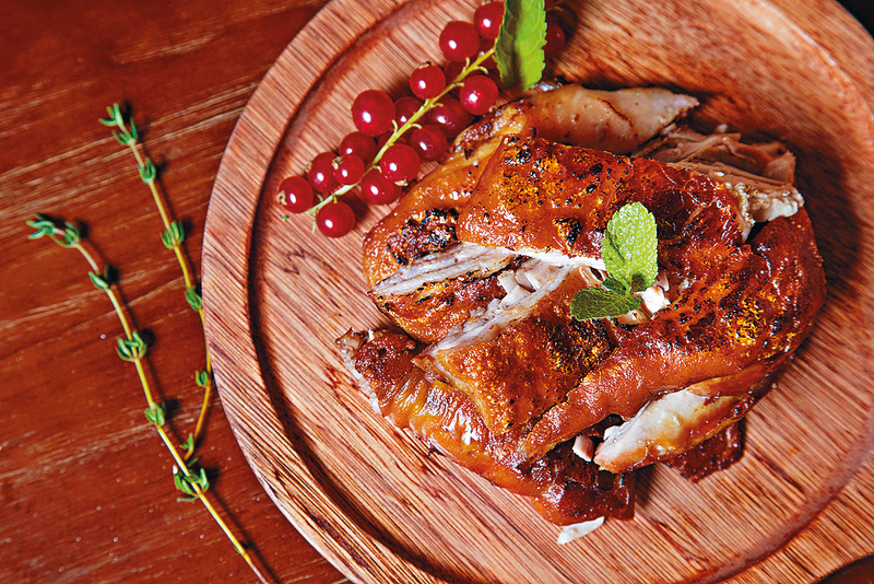 招牌菜鱿鱼酿红椒是心机手作,将炒香的鱿鱼粒及洋 粒,与香草、脆面包粒、忌廉芝士拌成馅料,酿进西班牙红椒中再扎好,即叫即焗,配以惹味的墨西哥辣椒蒜蓉蛋黄酱、炸金菇及墨汁脆片,味道和口感具层次。姜味橙香烧黑毛猪肩扒特别香软,因选用伊比利亚猪少见部位,不用煮至全熟享用。煎香的猪肩扒,先涂上橙姜汁,再以火枪烧至微焦,酱汁以红椒、茴香、辣椒制成。
