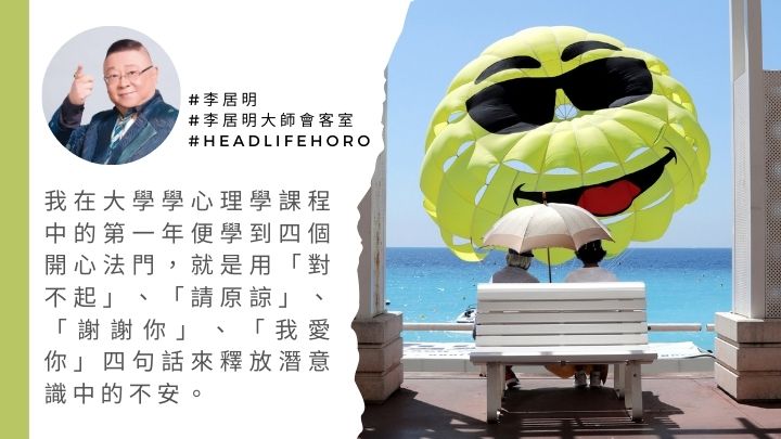 忏悔是宗教的最高智慧,与心理治疗法第一个教你说「对不起」是不谋而合。心理学有一种疗法,我在大学学心理学课程中的第一年便学到四个开心法门,就是用「对不起」、「请原谅」、「谢谢你」、「我爱你」四句话来释放潜意识中的不安。举例,当你的脚痛,就对脚说对不起!你有胃病,对胃说对不起!你心脏不好,就对心脏说对不起,身体哪个器官不健康,你向这个器官忏悔,然后说「请原谅我,请给我改正的机会」,接着说「谢谢你」、「我爱你」,感恩每个器官的不离不弃,这样你的内心焦虑和紧张就获得释怀。只要向身体中不健康的器官忏悔,你会遇到一位良医,遇到一种灵药的治疗,令你逐渐康复。