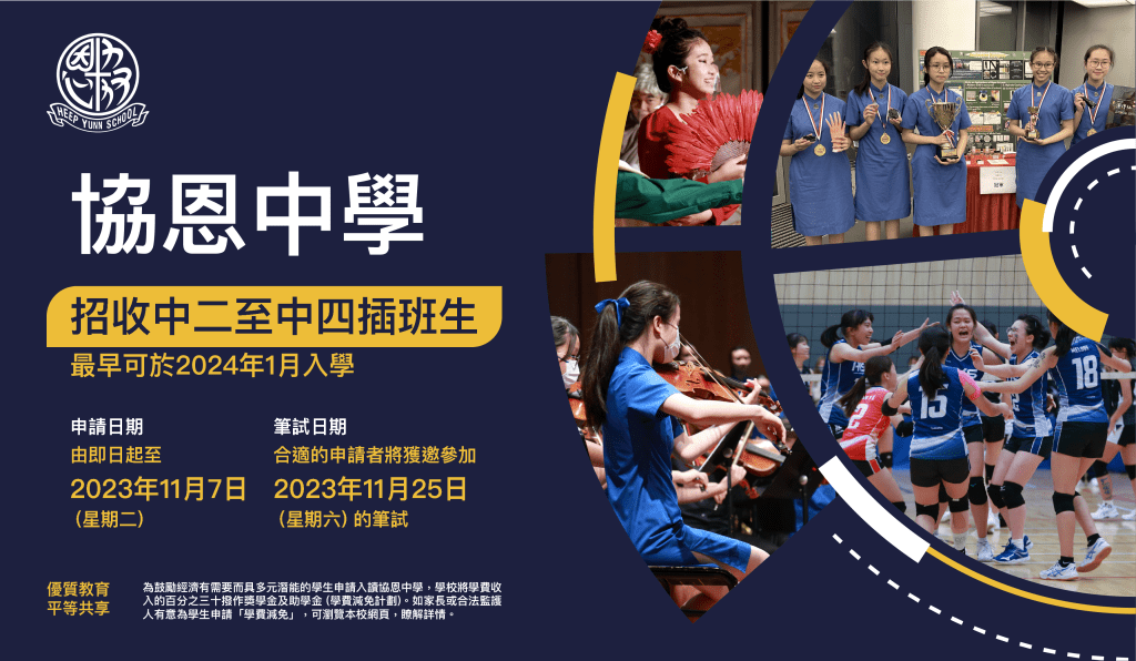 传统名校协恩中学为圣公会辖下的直资女校,秉承基督精神,推行全人教育。学校重视知识传授,并投放大量资源,通过运动、音乐、语文、科研、辩论、戏剧、义工服务等不同活动,启迪学生发展多元潜能,培养关社爱群精神。学校现正接受中二至中四的插班生申请;由即日起至2023年11月7日,有意者可浏览协恩中学网页,了解申请详情,然后填写网上申请表[按此]。顺利通过笔试及面试的学生,最快可于2024年1月入学。另外,协恩中学拟于2024年4月中旬至5月上旬接受24/25学年中二至中四的插班生申请,有意者可适时留意协恩中学网页。
