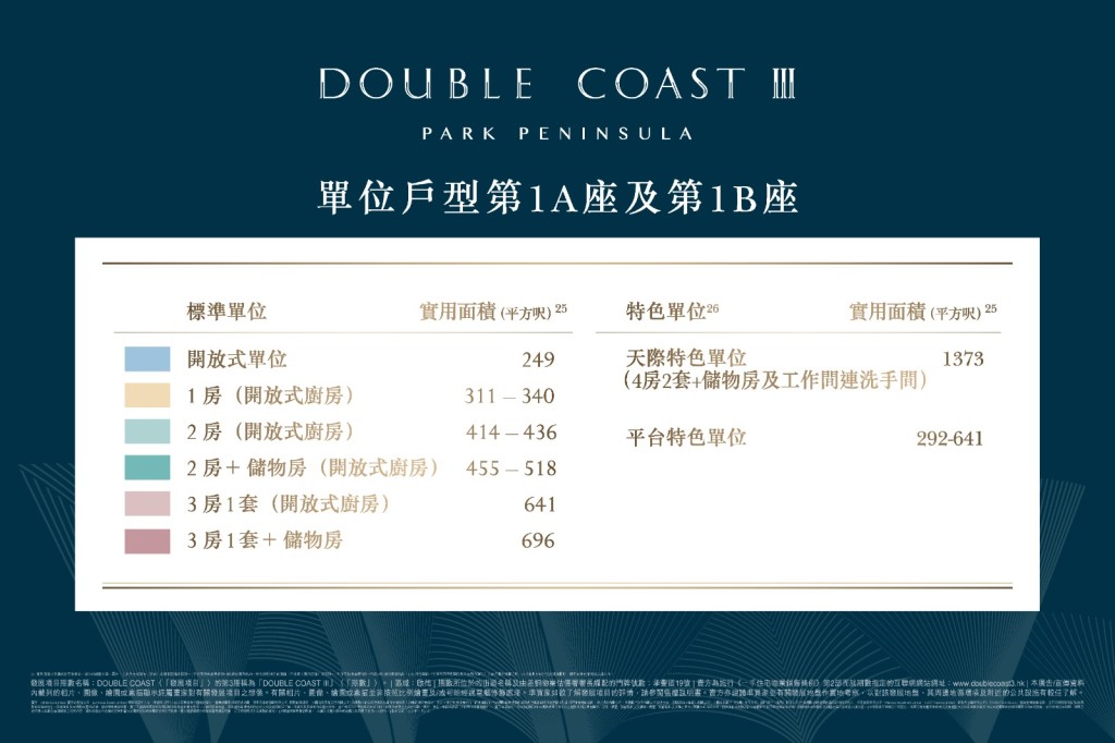 会德丰地产、恒基、中国海外及新世界合作发展的启德临海现楼DOUBLE COAST III刚上楼书,合共提供525伙,面积249至1,373方呎,涵盖开放式至3房套连储物房,另设天际特色户及平台特色户。