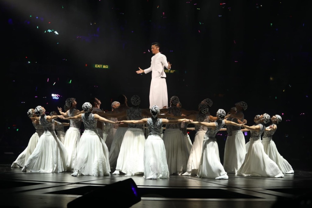 晚上8点半,华仔身穿白色唐装长袍登场,唱出一曲《预谋》,其后更脱去大袍展现旗麟臂打鼓。之后华仔换上粉色唐装衫唱《笨小孩》,睽违8年再踏红馆舞台,华仔说:「8年前生的(小孩)都已经8岁啦,我好想感受下7至8年前有过的掌声。」接著他躺在地上感受大家掌声,说:「我已经忘记了,你们还记得吗?我都老啦。」华仔续说去年发生堕马意外事件。(摄影:朱伟彦)