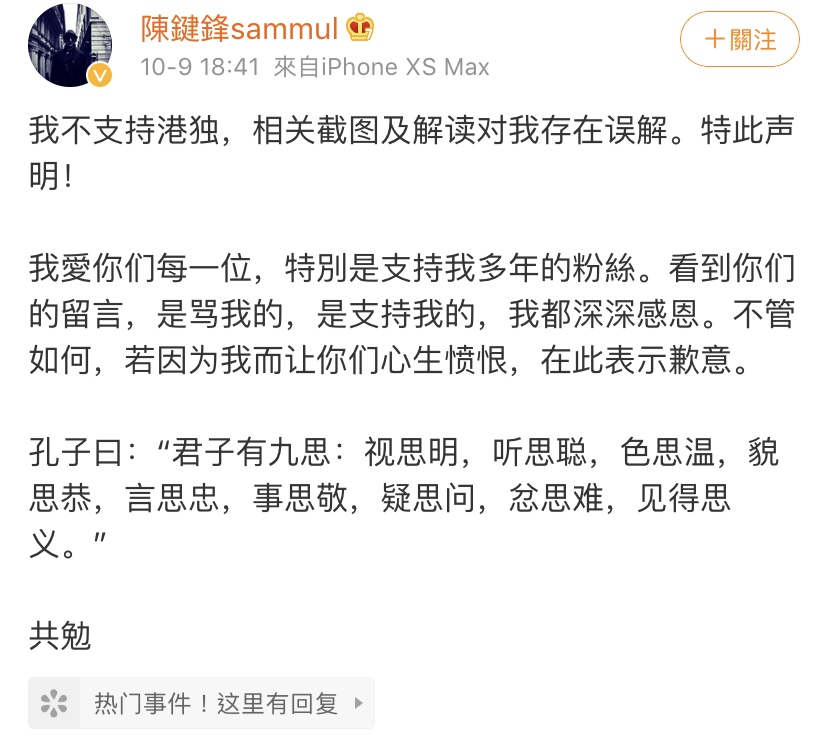 陈键锋被指是支持港独的事件,在内地引起热议,而陈键锋的名字更成为微博热搜。陈键锋昨日在微博发表声明否认支持港独。声明又指,「不管如何,若因为我而让你们心生愤恨,在此表示歉意。」