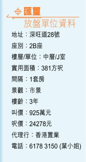 全屋楼底颇高,采浅色装潢,且设多幅玻璃窗采光,一室高旷亮丽。开放式厨房位于客厅一隅,已设厨柜及嵌入式家电,方便住户下厨及收纳物品。客厅尽头外连露台,可望深水埗一带市景。房间为套房设计,大门与套厕之间设有一道趟门,以增加就寝空间的私隐度。