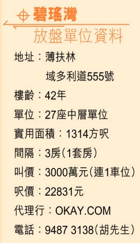 站于露台,可望屋苑前排单位及饱览西博寮海峡景致。薄扶林碧瑶湾毗邻数码港商场,商场内食肆云集,亦设有不同零售商舖及戏院等,可满足住户吃喝玩乐的需要。是次为各位精选了屋苑的3房1套单位,实用面积1314方呎,外望西博寮海峡,业主现时连1车位叫价3000万,实用呎价约22831元。睇楼王房间贴上花纹墙纸,装潢充满复古气息。厨房为U形设计,洗涤、烹饪及切菜区域分开。
