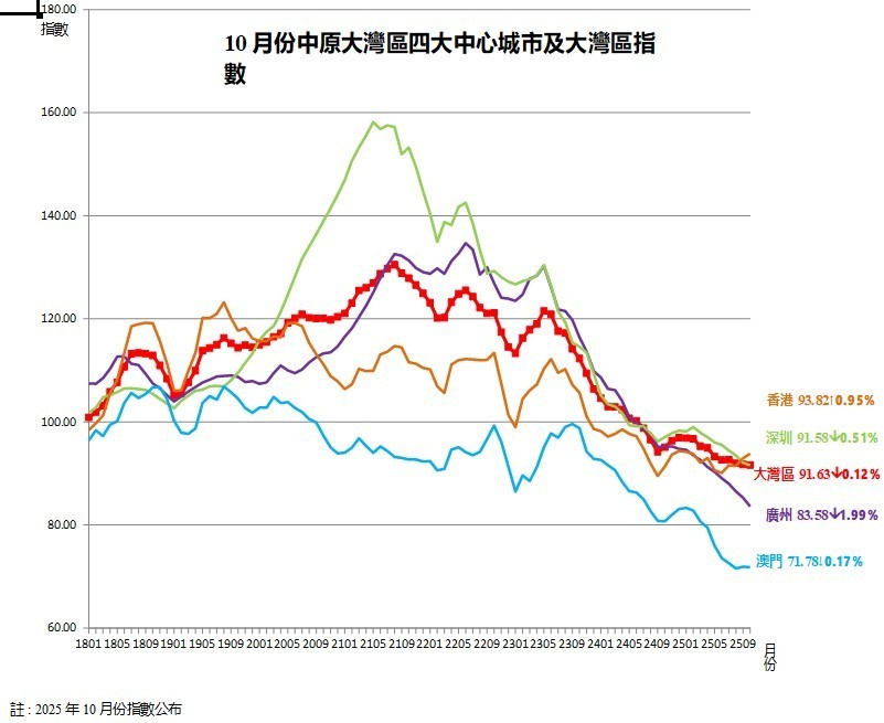 中原大湾区指数今年10月报91.63点,按月下跌0.12%。12个指数当中,8个下跌,幅度0.12%至7.54%;录得上升的4个指数,升幅0.13%至1.95%。四大中心城市指数,只有香港指数报升,其余三个指数再度下跌,深圳指数更再创历史低位。