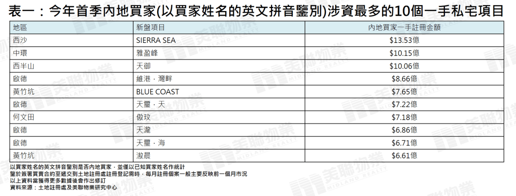 今年首季内地买家涉及金额最高的十大新盘中,西沙SIERRA SEA以约13.53亿元居首;中环雅盈峰及西半山天御则分别以约10.15亿及约10.06亿元紧随其后。值得注意的是,启德区成为最受内地资金追捧的地段,十大新盘中独占四席,包括维港.湾畔(约8.66亿元)、天玺.天(约7.22亿元)、天泷(约6.86亿元)及天玺.海(约6.71亿元)。