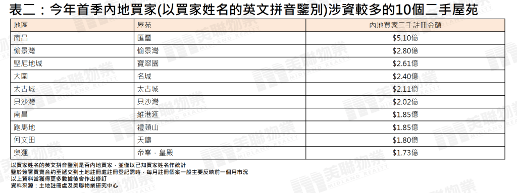二手方面,内地买家今年首季涉及金额较多的屋苑,主要集中于楼龄相对较新的物业。位列首位的是南昌站汇玺(约5.1亿元);其余包括愉景湾(约2.8亿元)、宝翠园(约2.61亿元)、名城(约2.4亿元)、太古城(约2.11亿元)及贝沙湾(约2.02亿元)均涉资逾2亿元。不难发现,涉资二手市场较多的物业不乏楼龄相对较新的屋苑,而传统屋苑则相对较少。