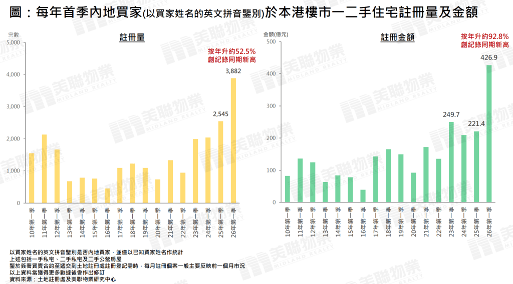 美联物业研究中心综合土地注册处资料,按已知买家姓名英文拼音进行分析。数据显示,今年首季内地买家涉资共约426.9亿元,其中一手物业金额高达约246.6亿元,比起同期约180.4亿元的二手住宅金额大幅高出约36.7%,可见内地买家购买力明显倾向一手物业。