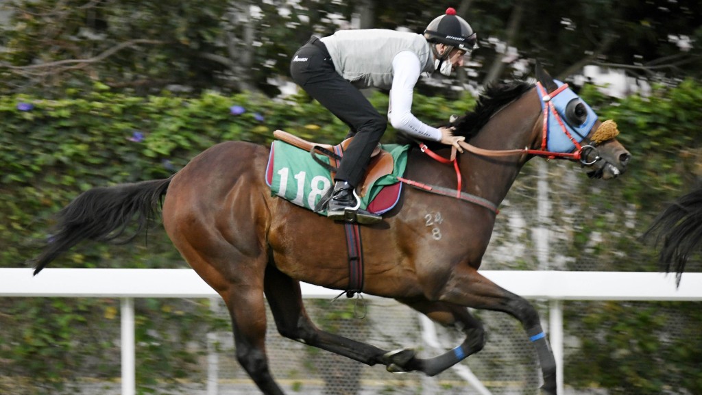 「骏马快车」助手踱一圈,复课不久未见疲态,马身保持粗壮,步伐硬朗劲度足够,朝气勃勃仍勇锐。