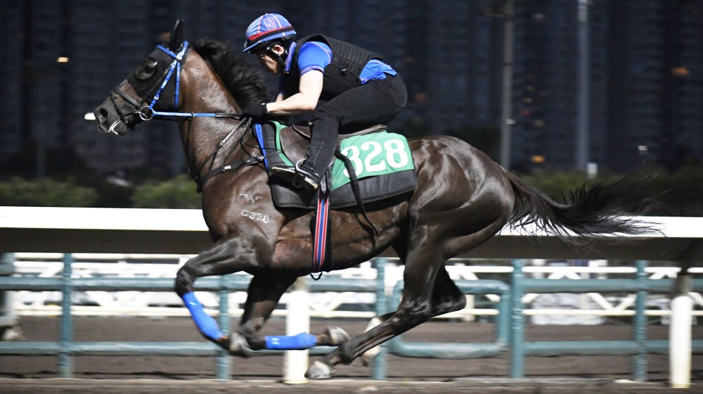 「红海舍」副练拍「善传万里」助手跳两段,前驹戴头罩,外档走来少许急口,但修正后再无问题,走势爽劲,马身亦结实;后驹试来仍带点牵强,末段要骑要推,状态明显未够。