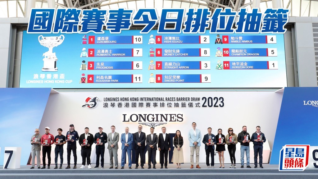 二○二三年度香港国际赛事,将于周日在沙田马场举行,香港赛马会于今晨在沙田马场亮相圈,为四场国际赛进行排位抽签,多匹参赛马的练马师、马主、马会及赞助商高层亦有出席,场面十分热闹。不过抽签结果照例有人快乐有人愁,尝试追平「好爸爸」赢出三届香港一哩锦标的马王「金鎗六十」不幸排在十四档,另外卫冕香港杯冠军「浪漫勇士」则抽得七档。