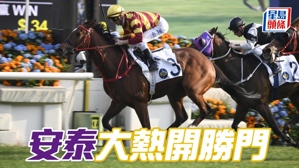 「安」系王氏家族旗下马匹在今季大丰收,继早前「安遇」和「安骋」后,另一匹豢养在蔡约翰马房的「安泰」,今午由潘顿策骑击败「佳福驹」,赢得在港首场头马。骑者亦火速赢得三十场头马,并且在骑师王成绩表上以四十分领先。