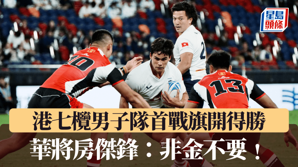 香港男子七人榄球队在全运会有个好开始!在启德主场馆举行的全运会七人榄球赛的第一场小组赛对卫冕的山东队,凭著4位代表接连达阵,港队以24:12取得首场胜利,下半场最后一个达阵的华将房杰锋信心十足的说港队是「非金不要!」