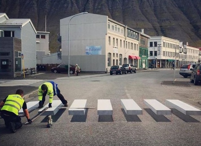 行人过马路要走斑马线,但有研究指,高达75%的驾驶人接近斑马线时仍维持原有车速,甚至加快车速。冰岛一座小镇最近试验「立体斑马线」,不但予人新鲜感,也希望有助提醒驾驶者减慢车速。冰岛环境专员特里拉(Ralf Trylla)表示,曾在印度新德里看过类似的视觉假象,决定引入冰岛,委托一间街头绘画公司将西峡湾区渔业小镇伊萨菲厄泽(Ísafjörður)的斑马线立体化。立体斑马线看似会随距离和角度移动一般,白线从上面看下去像一根根柱子,从地面看又像凌空一样,相信许多驾驶人看到都会减速。斑马线能否有助促进交通安全,效果有待观察。事实上,中国湖南长沙县星沙巿2年前也曾开始划设立体斑马线,有民众称,驾车接近斑马线时,确实会想放慢速度欣赏。
