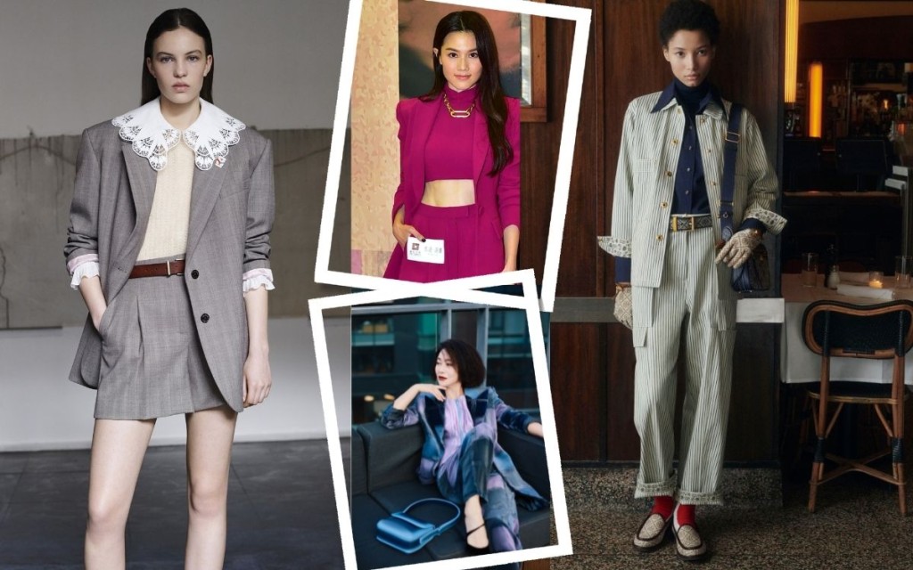 套装组合在今季大放异采,各大品牌的秋冬系列Look Book,如MAX&Co.、Maje、Paul Smith、Tory Burch及Sandro都可见到风格不同的Matching Set造型,不论是复古优雅的配搭,还是中性造型,都是亮点。现活跃影坛的周秀娜、既是影后又是视后的惠英红,最近都不约而同以Matching Set造型现身公开场合,展现时代女性型格。前者以Alex Perry莓红绉纱西装褛与阔脚长裤,配衬短身高领上衣,露出小蛮腰,展示性感美态。后者则以Giorgio Armani秋冬装上阵,蓝色天鹅绒长身外套,下配同色系长裤,再配以粉红色褶裥上衣,贵气亦优雅。