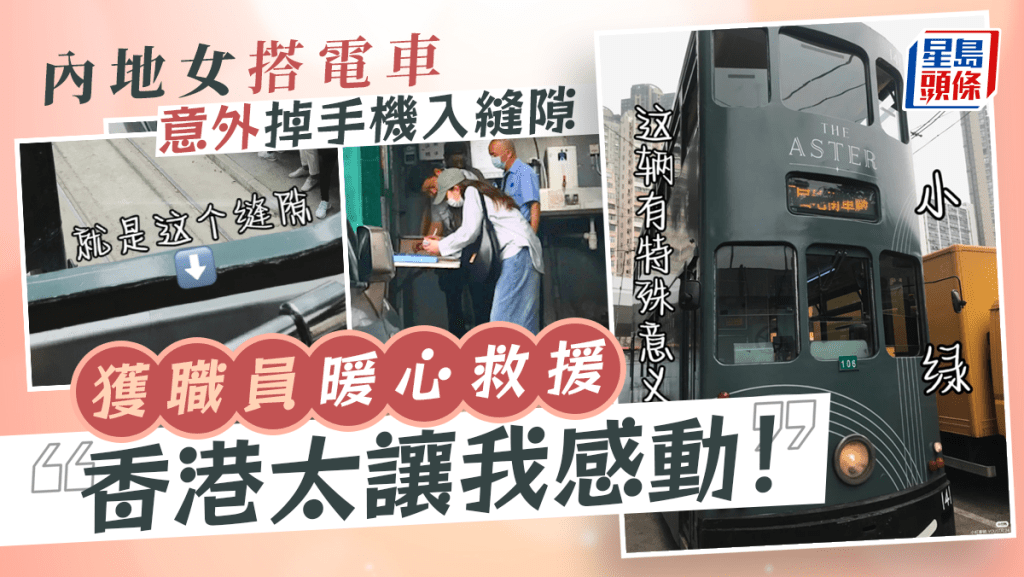 这位内地女网民近日在小红书发帖,以「香港 你真的是我太让我感动了」为题,文中写道「虽然不知道他们的名字 但真的人好好 好负责啊!」,文末更标签「香港」、「好人一生平安」及「叮叮车」。同时帖文亦上载了5张相片,当中提及楼主这次在香港搭电车遇上小意外的详情。事缘楼主在香港搭电时,选择坐在上层最前排的位置,一不小心将手机掉进窗户的缝隙中,「我愣了会儿(脑子里闪过的都是我手机里的东西怎么办!!我的手机还能拿上来吗!!),然后我就去找司机」。