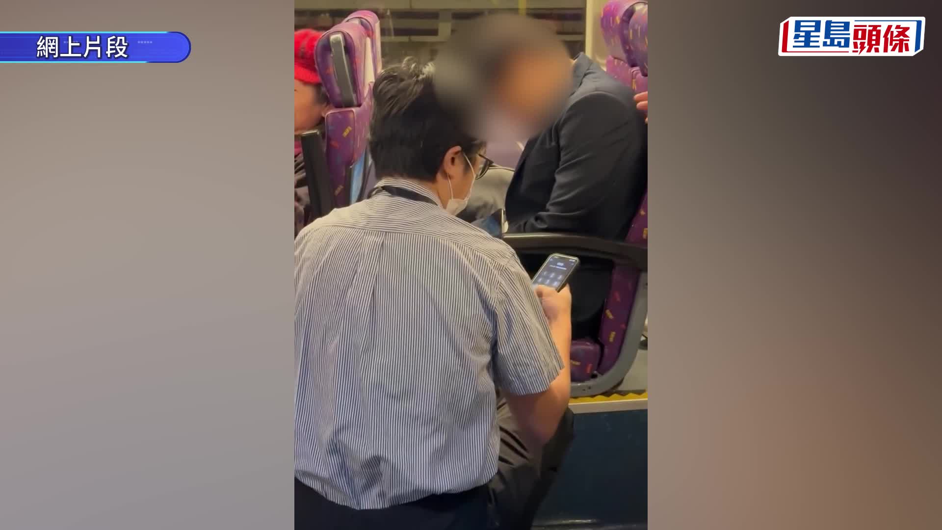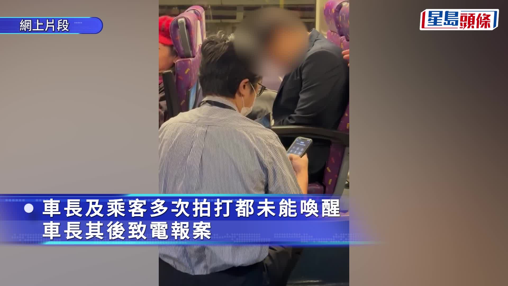 重播 立即播放 巴士车厢外籍西装男疑陷昏迷 多人拍叫摇晃无反应 救护员到场证虚惊 网上近日流传一段车厢短片,引起市民关注。一名身穿西装、戴着耳机的外籍年轻男乘客,在城巴619线上突然毫无反应,车长与其他乘客多次拍打及呼唤均未能唤醒,情况一度令人忧心。 有网民在社交平台发文指,事发于本月19日(周三)晚上约11时08分,巴士驶经蓝田站往上水方向时,其他乘客首先发现事主异常,遂通知车长。片段所见,男乘客低头坐在座位上,一动不动,旁边放着一个旅行袋。车长多次呼唤「Hello」及拍打其 港闻 8小时前 阅读更多