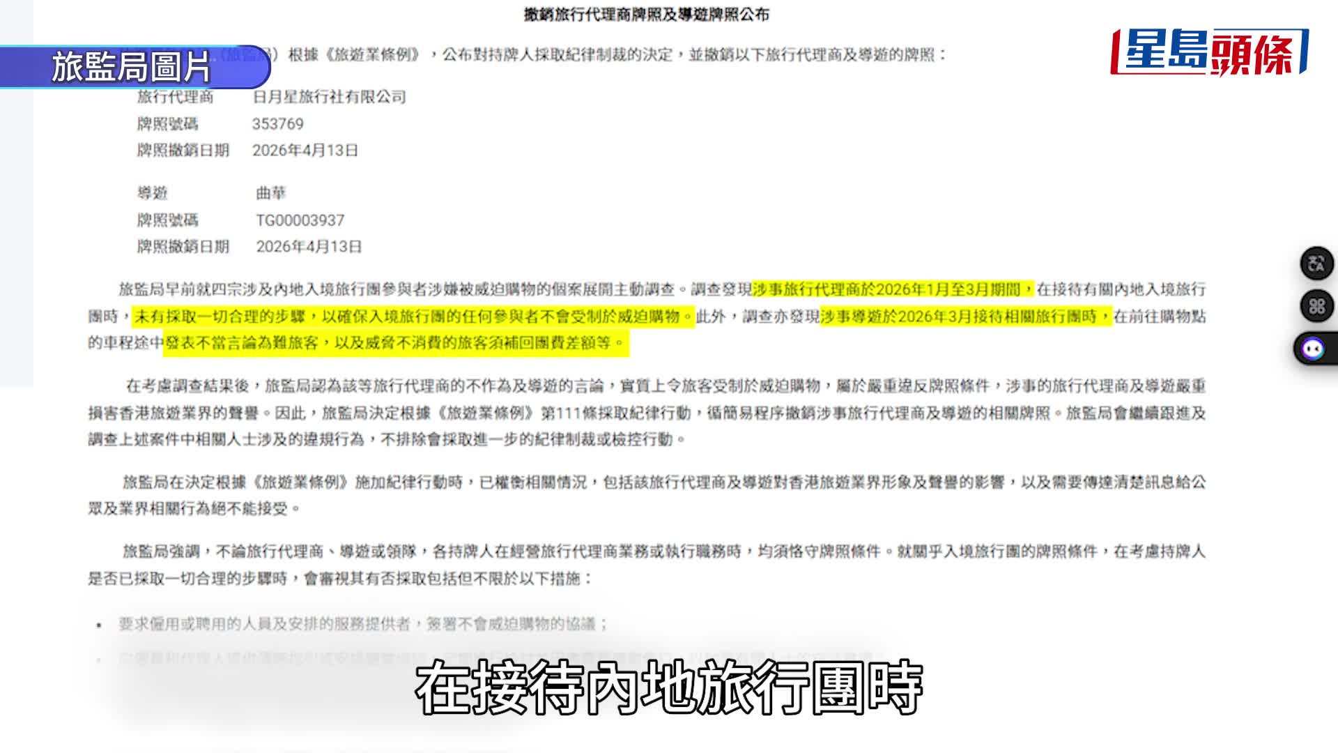 重播 立即播放 日月星旅行社涉威胁内地团友购物遭钉牌 公司大门用纸皮封上 仍有着灯惟无人应门 旅游业监管局今早(13日)宣布撤销「日月星旅行社有限公司」牌照,指涉威逼内地旅行团旅客购物等。《星岛头条》记者下午上门查询,发现其登记地址位于尖沙咀汉口中心的公司大门已用纸皮封实,无人应门。 公司内仍亮灯 惟记者按钟无人应门 记者上楼后所见,公司玻璃正门已用纸皮和纸张完全封住,透过纸张缝隙可知内里仍亮灯,惟记者按门铃无人应答,拨打旅行社电话未有人接听,入口位置则能听见室内传来电话铃声。此外,入口招 港闻 4小时前 阅读更多